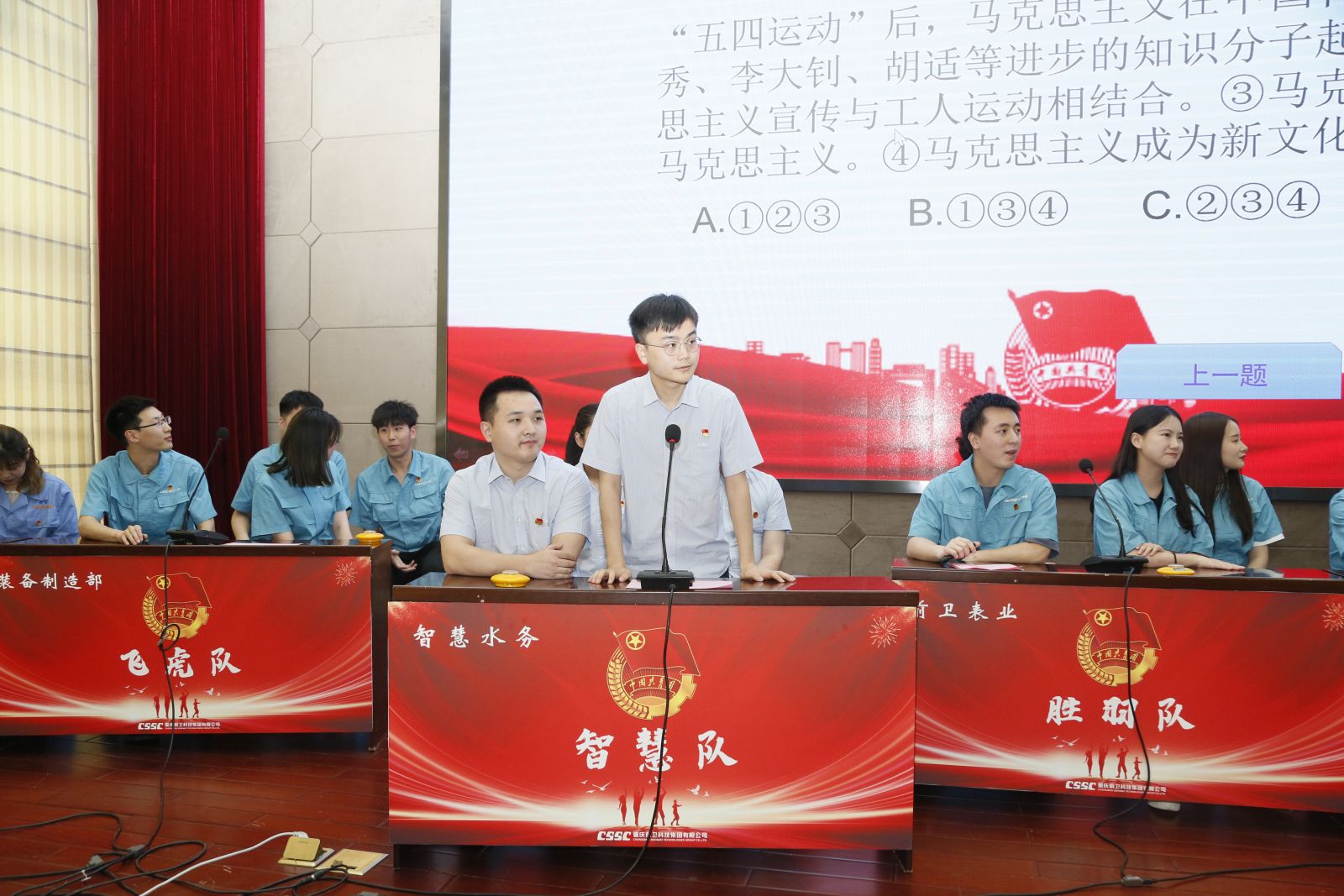 表彰會(huì)后,慶祝建團(tuán)百年知識(shí)競(jìng)賽火熱展開(kāi)。來(lái)自各基層團(tuán)組織的8支隊(duì)伍同場(chǎng)競(jìng)技。最終,前衛(wèi)無(wú)線&工程事業(yè)部(聯(lián)隊(duì))獲得一等獎(jiǎng),技術(shù)中心、職能部門(mén)獲得二等獎(jiǎng),前衛(wèi)表業(yè)、智慧水務(wù)、科凱前衛(wèi)獲得三等獎(jiǎng)。